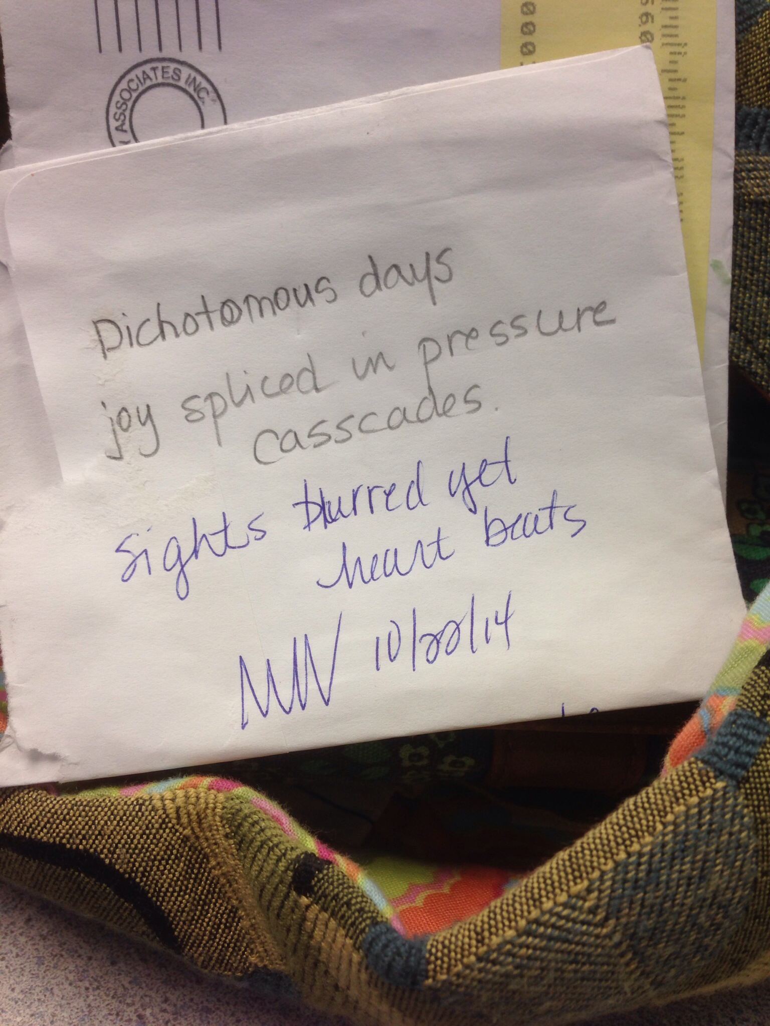 Share the creativity: Click to share on Facebook (Opens in new window) Facebook Click to share on X (Opens in new window) X Click to share on LinkedIn (Opens in new window) LinkedIn Click to share on Pinterest (Opens in new window) Pinterest Click to email a link to a friend (Opens in new window) Email Like Loading... Related Write it down. Wherever I am. Whenever I can. Capture the thought to move forward. October 23, 2014 / autumncircles / Leave a comment